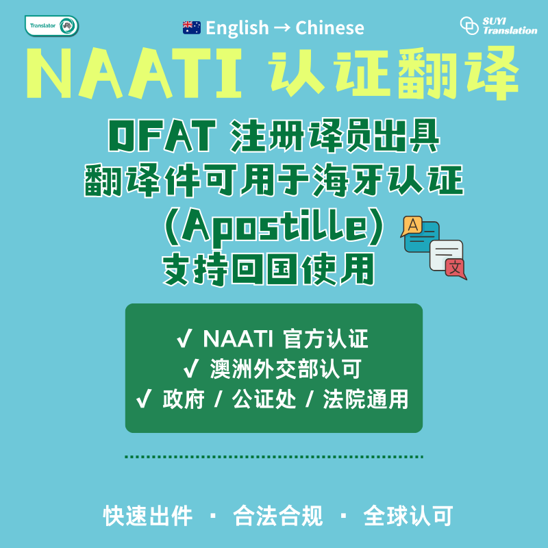 速译提供由 NAATI 认证译员 出具的官方认证翻译服务,翻译件可用于 澳洲外交部(DFAT)海牙认证 Apostille,并支持 回国及全球多国官方机构使用